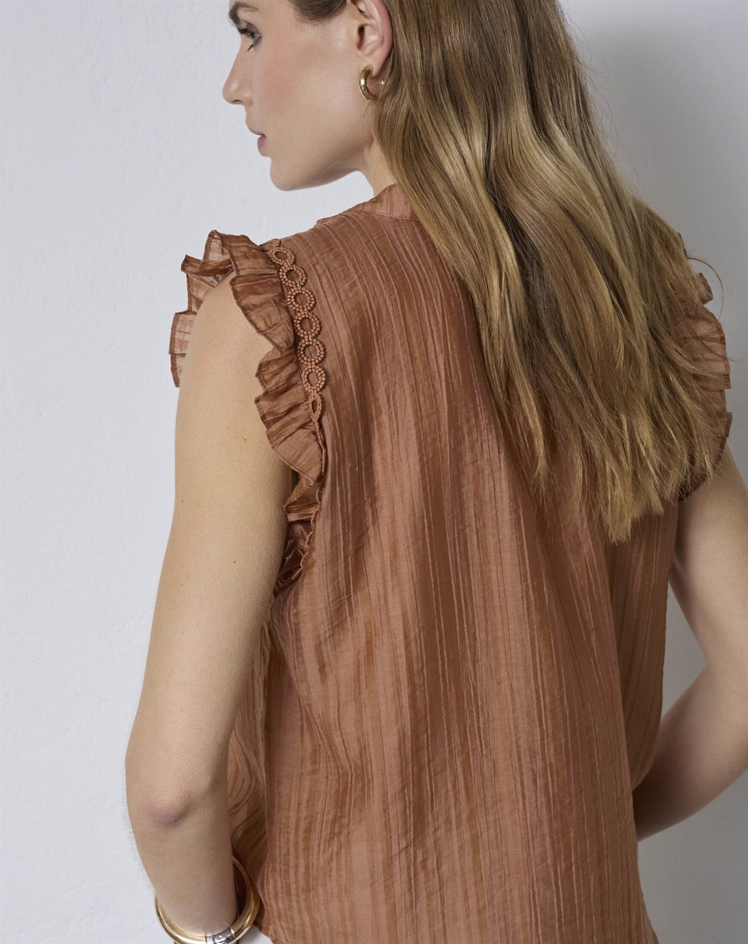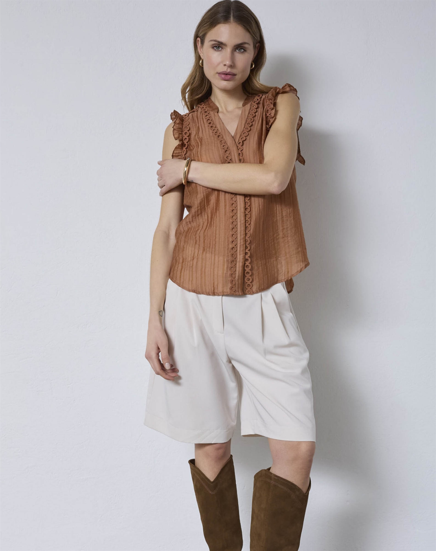 Hvorfor vil du elske denne top? For det første er den alsidig – den kan let dresses op eller ned afhængigt af anledningen. For det andet giver den en følelse af lethed og femininitet med sine delikate flæser. Desuden er den ofte skabt i bløde stoffer, der sikrer komfort hele dagen. Til sidst, den varme Suntan-farve fremhæver solbrændt sommerhud på smukkeste vis.