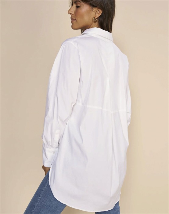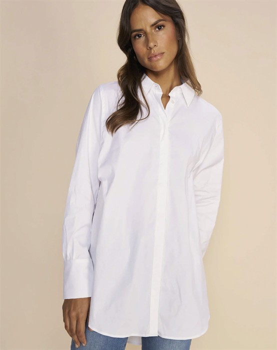 Enola Skjorte - Mos MoshSkøn skjorte med fine detaljer fra Mos MoshOversized pasform i skøn kvalitetGennem knappet med skjult knappelukningKlassisk krave samt fine detaljer på ryggenEnola skjorte blusen fra Mos Mosh pige er en populær del af brandets basis program. Ønsker du en skjorte, der altid er klædelig til både hverdag, reception, cafebesøg og meget andet, så er Enola skjorten lige noget for dig. Den har et lækkert og spændende snit med sit mere boxede design, der tilfører skjorten både volumen og længde. De skjulte knappelukninger gør ligeledes skjorteblusen mere elegant at se på. Er du én af dem, der elsker mere længde bagtil i dine skjorter, så er denne smarte skjorte også lige noget for dig. Enola skjorten findes i stilrene basis farver og kan styles til både smalle og brede pæne bukser, men er også super cool til jeans eller skind i alle pasform varianter.
