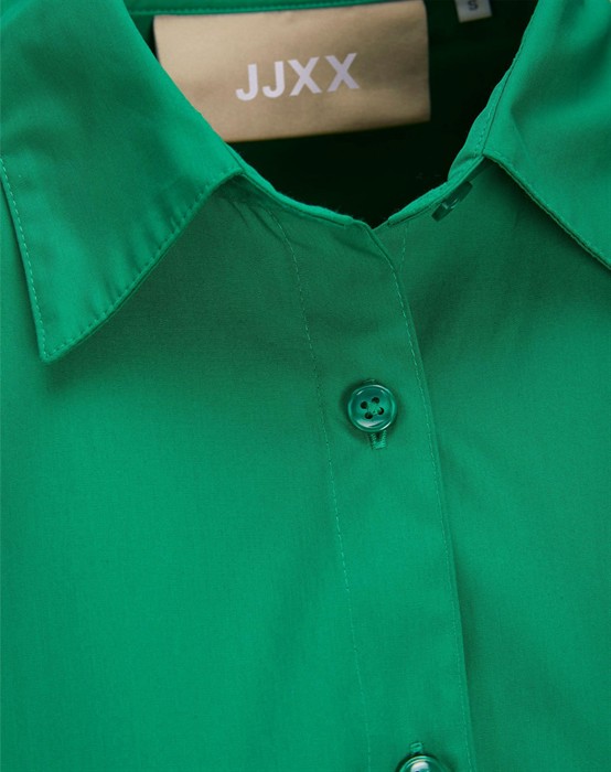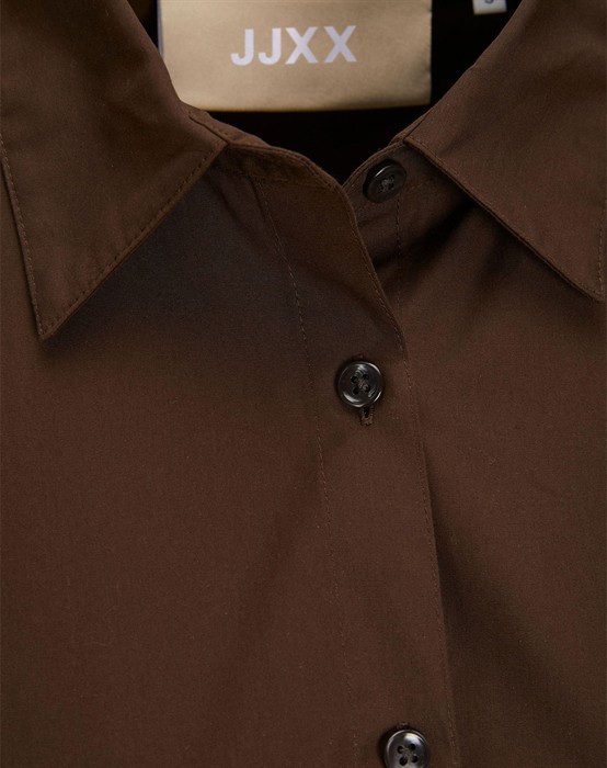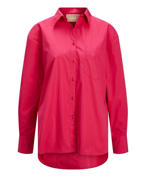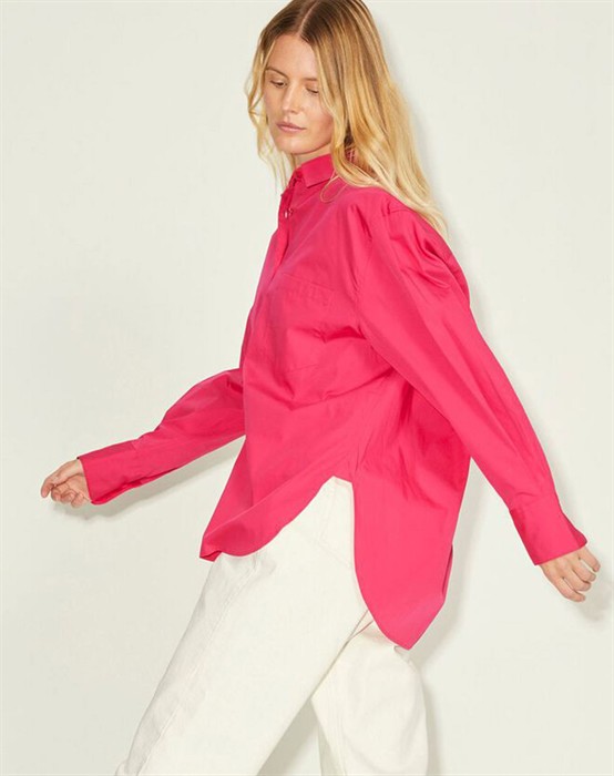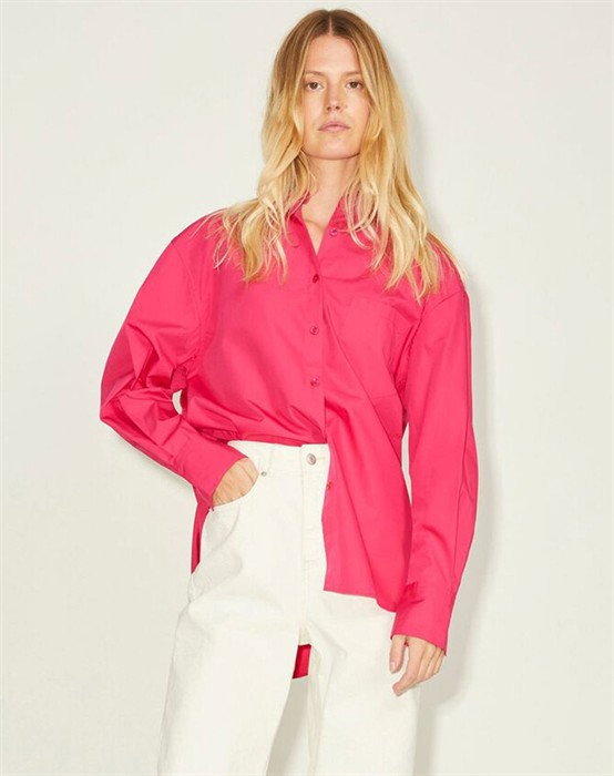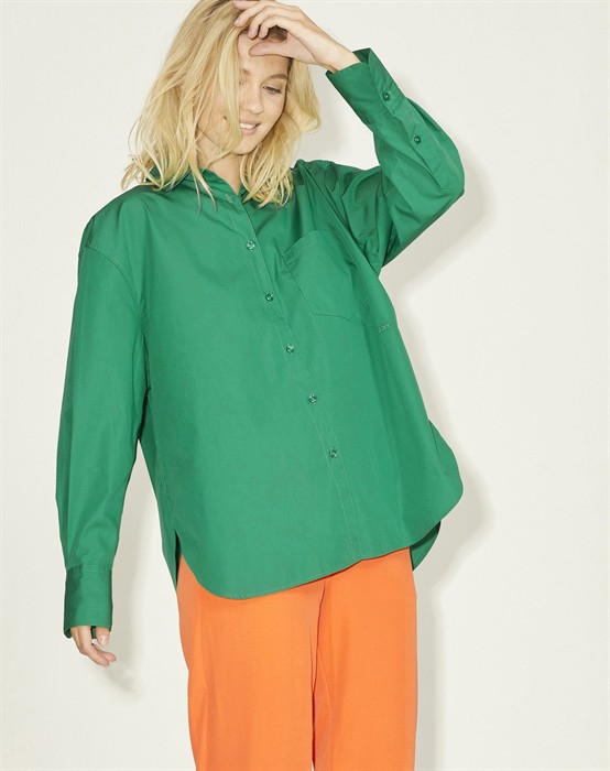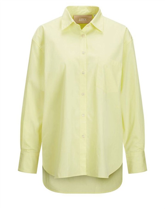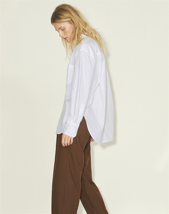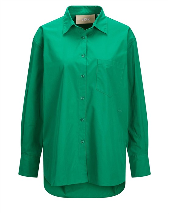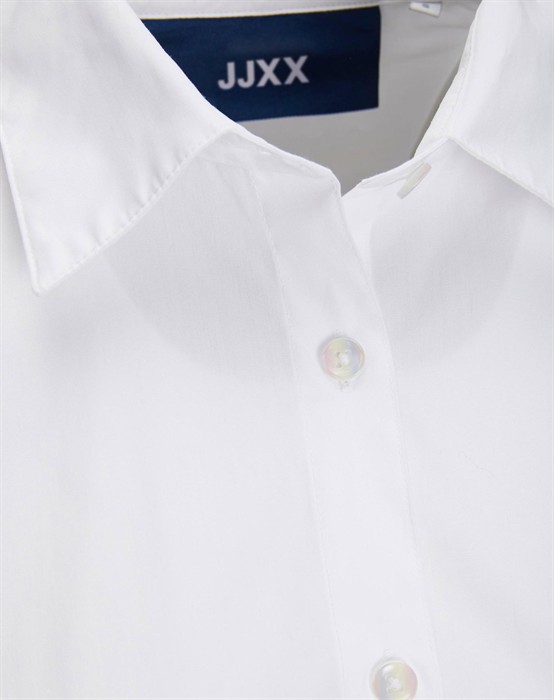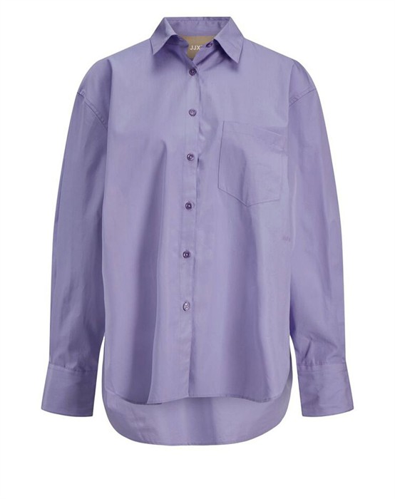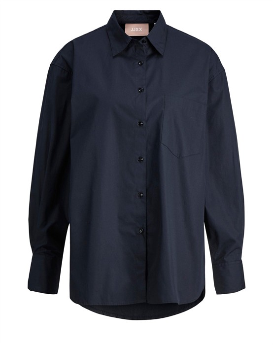 Lækker basic skjorte fra den lækre brand JJXX. Skjorten er lavet i en lækker bomuldskvalitet, der gør den super skøn at bære dagen lang. Skjorten er designet med en klassisk skjortekrave, knappelukning, lomme på brystet samt lange ærmer og en smule længere bagpå end foran. Skjorten har en løs pasform og drop-down skuldre, der giver en cool og afslappet pasform. Derudover har skjorten en lille fin detalje, den har et lille broderet logo under lommen foran.