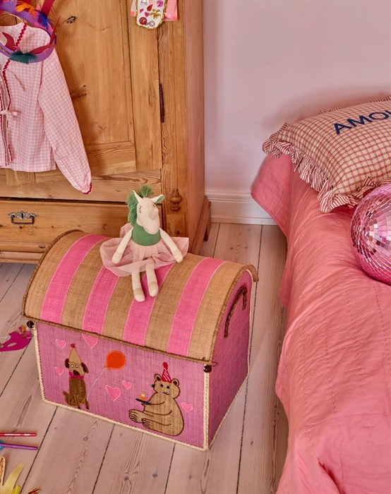 Denne søde enhjørning-bamse hører til Rice Kids' magiske univers. Oplev mange nuttede bamser, som denne. Enhjørningen er i en blød kvalitet, som både kan krammes i sengen og leges med på gulvtæppet. Slip fantasien løs med bamsen med det lyserøde balletskørt, grønne manke og fine detaljer i guld.