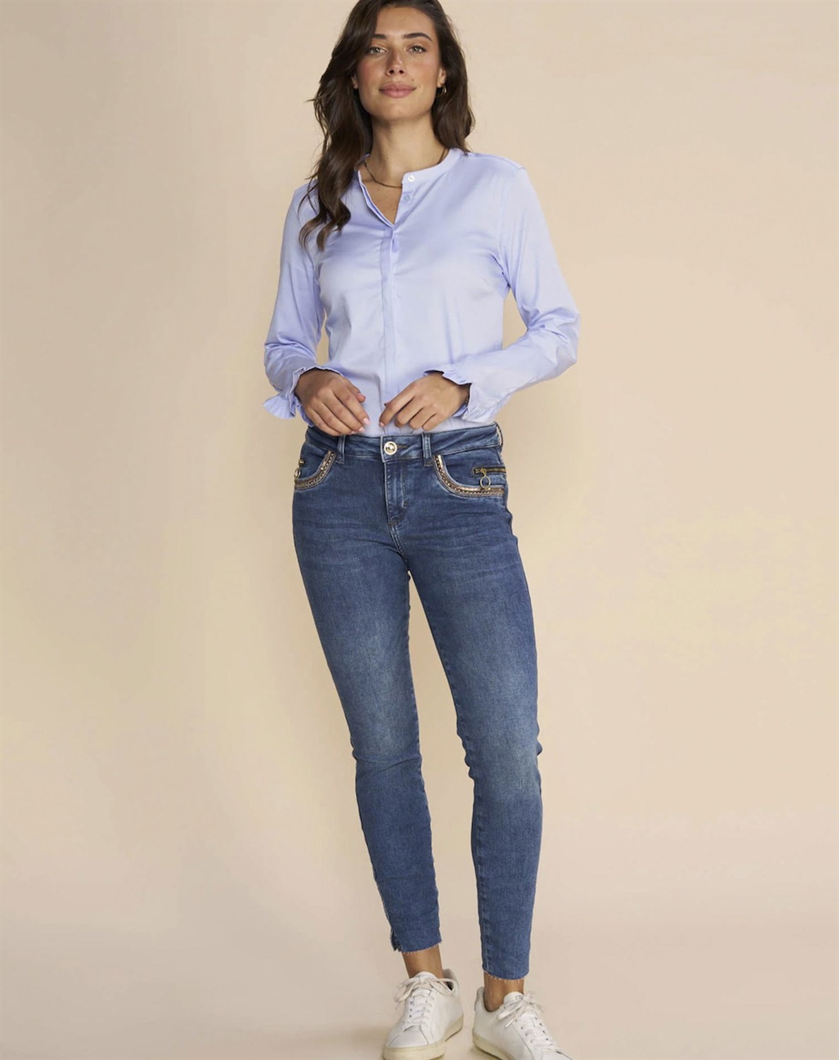 Denne smarte og feminine skjorte fra Mos Mosh damekollektion er perfekt til dig, der elsker at kombinere et klassisk look med et feminint strejf. Denne lækre skjorte i blød poplin kvalitet har smart kinakrave i halsen og flæser i ærmekanterne - begge dele detaljer, der gør skjorten både spændende og feminin. Så elsker du stilrent og klassiske designs på pigeskjorter, men helst vil undgå et decideret herrelook, så er Mattie skjorte fra Mos mosh dame lige noget for dig. Skjorten er samtidig blød og fleksibel, så den er rar at bære.