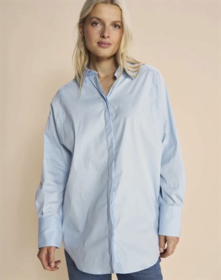 Enola Skjorte - Mos MoshSkøn skjorte med fine detaljer fra Mos MoshOversized pasform i skøn kvalitetGennem knappet med skjult knappelukningKlassisk krave samt fine detaljer på ryggenEnola skjorte blusen fra Mos Mosh pige er en populær del af brandets basis program. Ønsker du en skjorte, der altid er klædelig til både hverdag, reception, cafebesøg og meget andet, så er Enola skjorten lige noget for dig. Den har et lækkert og spændende snit med sit mere boxede design, der tilfører skjorten både volumen og længde. De skjulte knappelukninger gør ligeledes skjorteblusen mere elegant at se på. Er du én af dem, der elsker mere længde bagtil i dine skjorter, så er denne smarte skjorte også lige noget for dig. Enola skjorten findes i stilrene basis farver og kan styles til både smalle og brede pæne bukser, men er også super cool til jeans eller skind i alle pasform varianter.