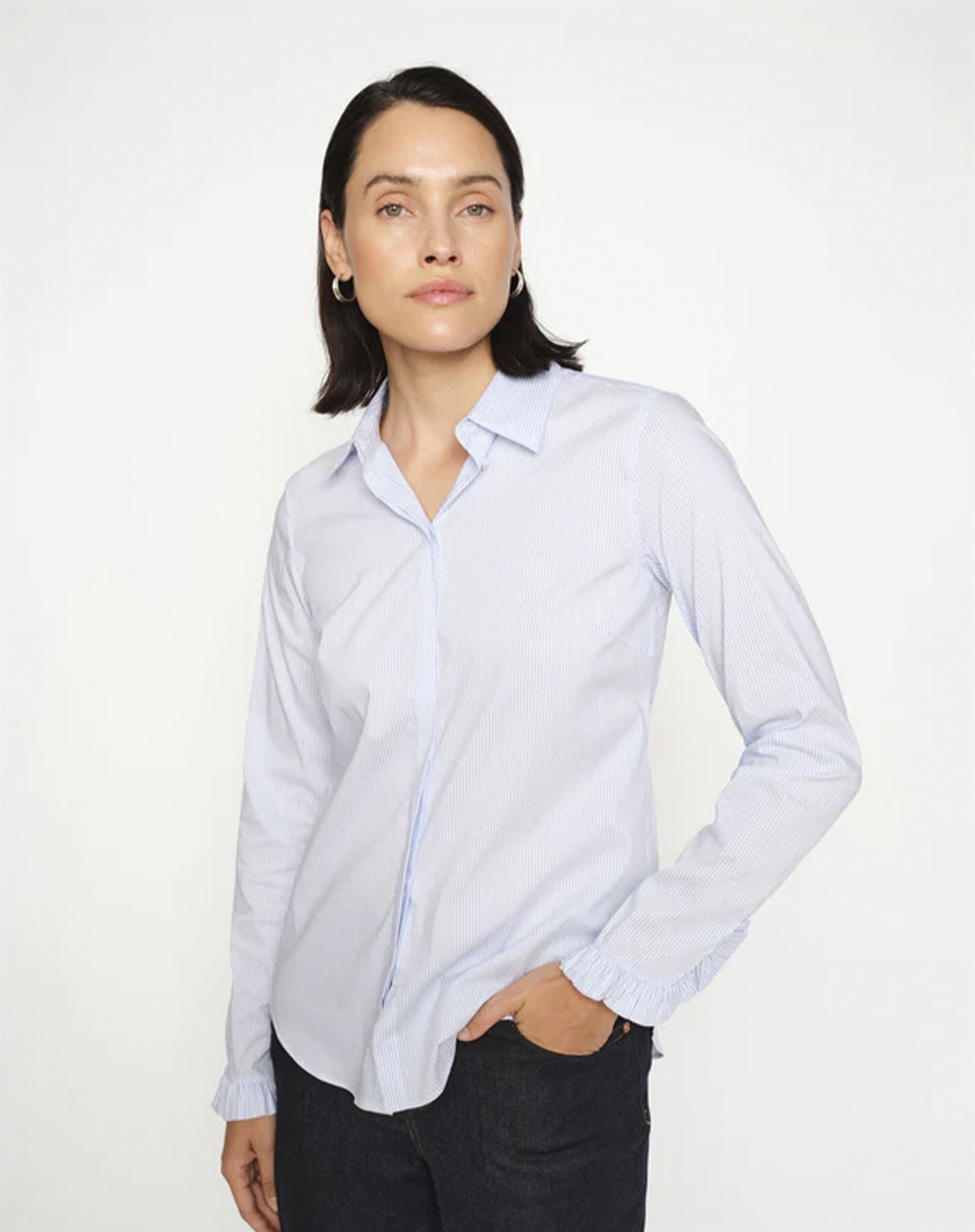 Den lyseblå nuance er let at style med neutrale toner som hvid eller beige for et stilrent look, eller du kan sætte den sammen med dine yndlingsjeans for en mere afslappet vibe. Ønsker du et mere sofistikeret udtryk, kan skjorten kombineres med en mørkere blazer, hvilket giver et godt samspil mellem det formelle og det afslappede.