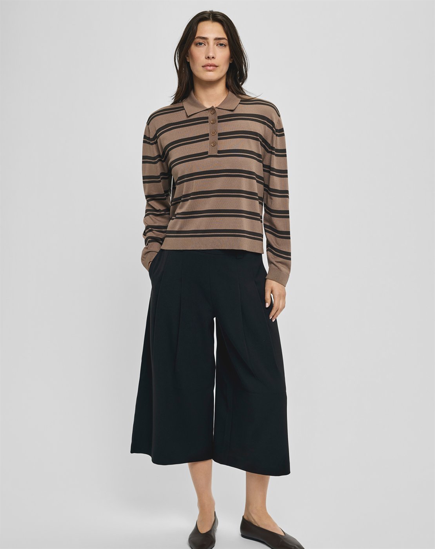 Der er noget elegant og tidløst over en sort culotte buks, og med MSCHMaryla Henrika Culotte Bukser fra MSCH Copenhagen rammer du plet på enhver måde. Denne buks er et vidnesbyrd om skandinavisk enkelhed og stil. Den løse pasform giver en skøn bevægelsesfrihed, mens den sorte farve tilføjer et strejf af sofistikation til dit outfit. Uanset om du er på vej til kontoret eller en afslappet aften i byen, er disse bukser en tro følgesvend. Forestil dig at style dem med en let striktrøje i neutrale toner for en afslappet, men elegant hverdagslook. Eller måske med en skarp, hvid skjorte og et par klassiske stiletter for at skabe et sofistikeret udtryk til en aftenbegivenhed. Med deres alsidige design er mulighederne næsten uendelige, og de passer smukt ind i enhver garderobe. Hvorfor vil du elske dem? For det første er de nemme at style, hvilket gør dem til en uundværlig del af din garderobe. De tilbyder også en skøn komfort med deres løse, men flatterende snit. Derudover kan de bruges til mange forskellige lejligheder, fra arbejdsdage til mere festlige sammenkomster. Endelig er den sorte farve en klassiker, der aldrig går af mode, hvilket sikrer, at du vil få glæde af disse bukser i lang tid fremover. MSCHMaryla Henrika Culotte Bukser - Black er en investering i tidløs stil og uovertruffen komfort. Lad dem blive en del af din daglige rotation og oplev, hvordan de tilføjer elegance og alsidighed til dit liv.