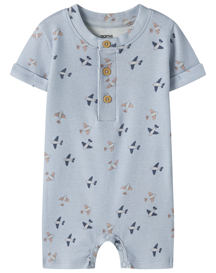 Alt i alt er NBMHop Sunsuit i Blue Fog et godt bud på en favorit i din babys sommergarderobe. Med sit tidløse design og praktiske anvendelse er det en dragt, der vil bringe glæde til både forældre og deres små eventyrere."}