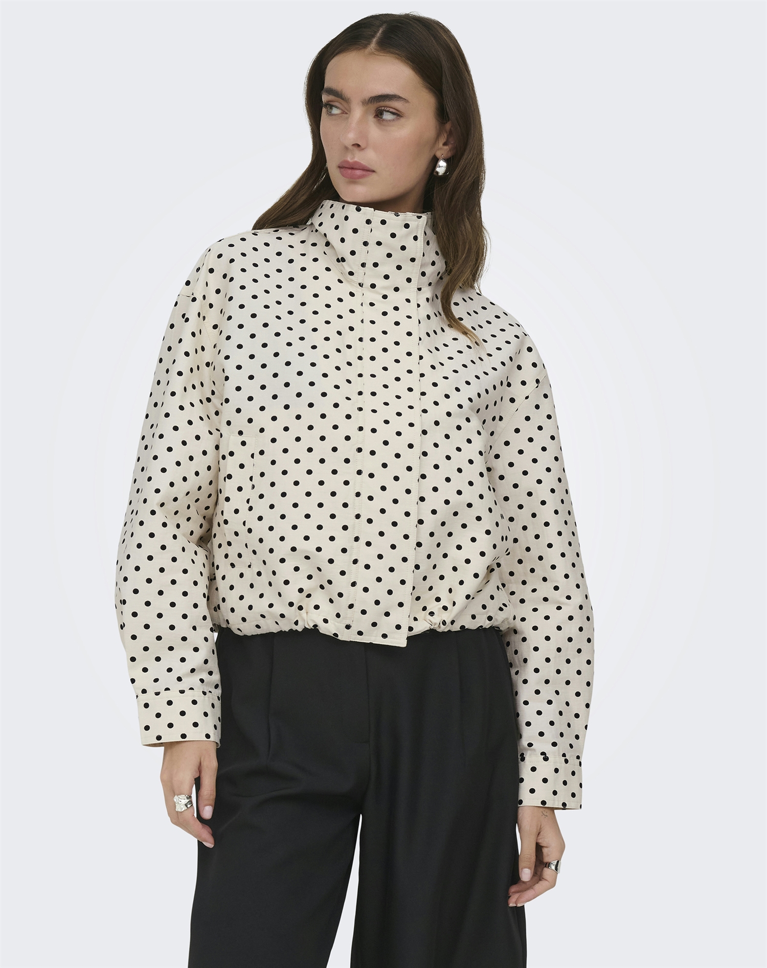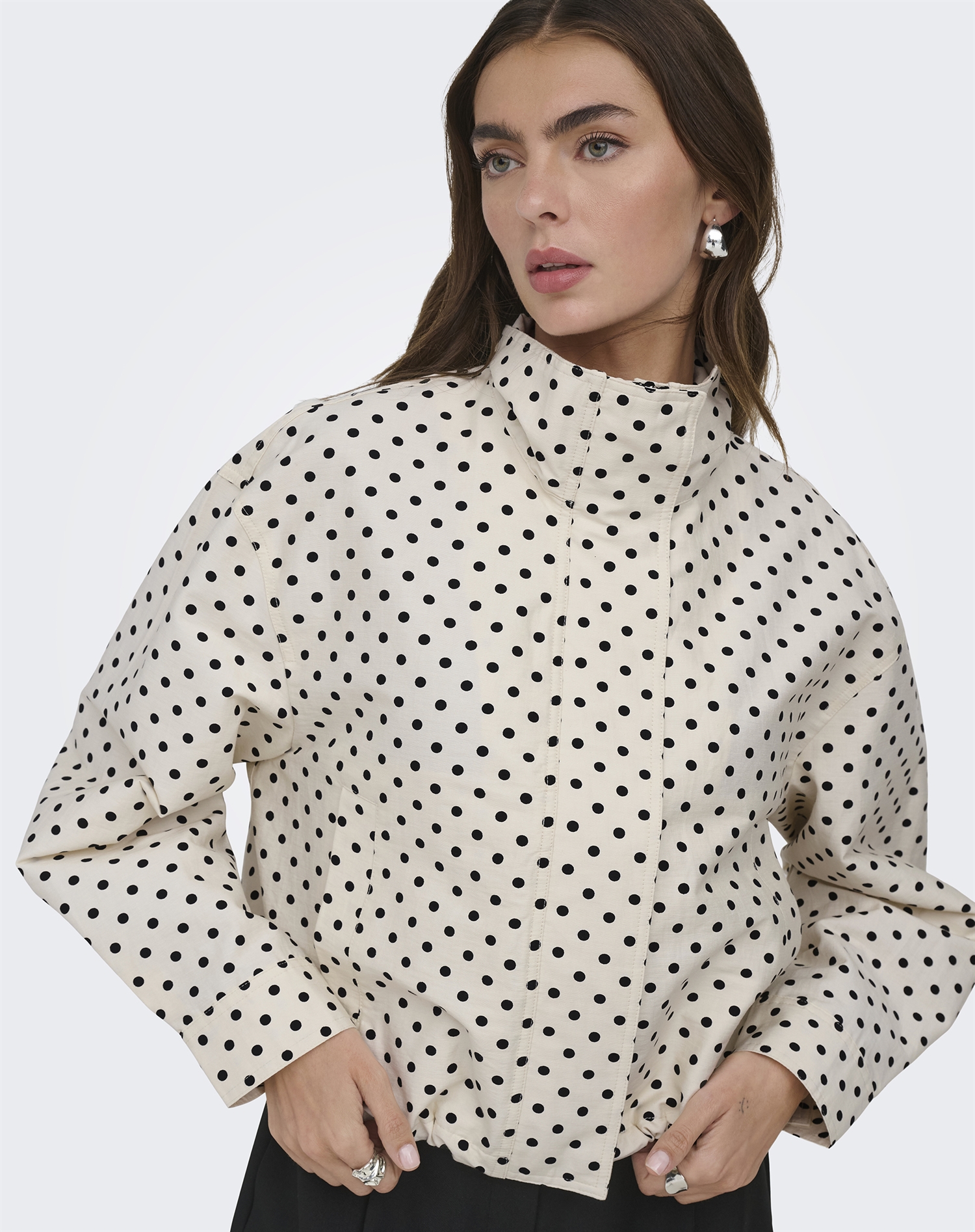 Forestil dig en kølig efterårsdag, hvor du har brug for noget let og alligevel opvarmende. Du kan matche denne jakke med et par mørke jeans og en enkel top, eller drapér den over en kjole til en aften ude. Dens alsidighed gør den til et ideelt valg, uanset om du tager på arbejde, en kaffe-date eller en afslappende gåtur i byen. Den prikmønstrede detalje giver dig mulighed for at lege med både neutrale og farverige accessories.