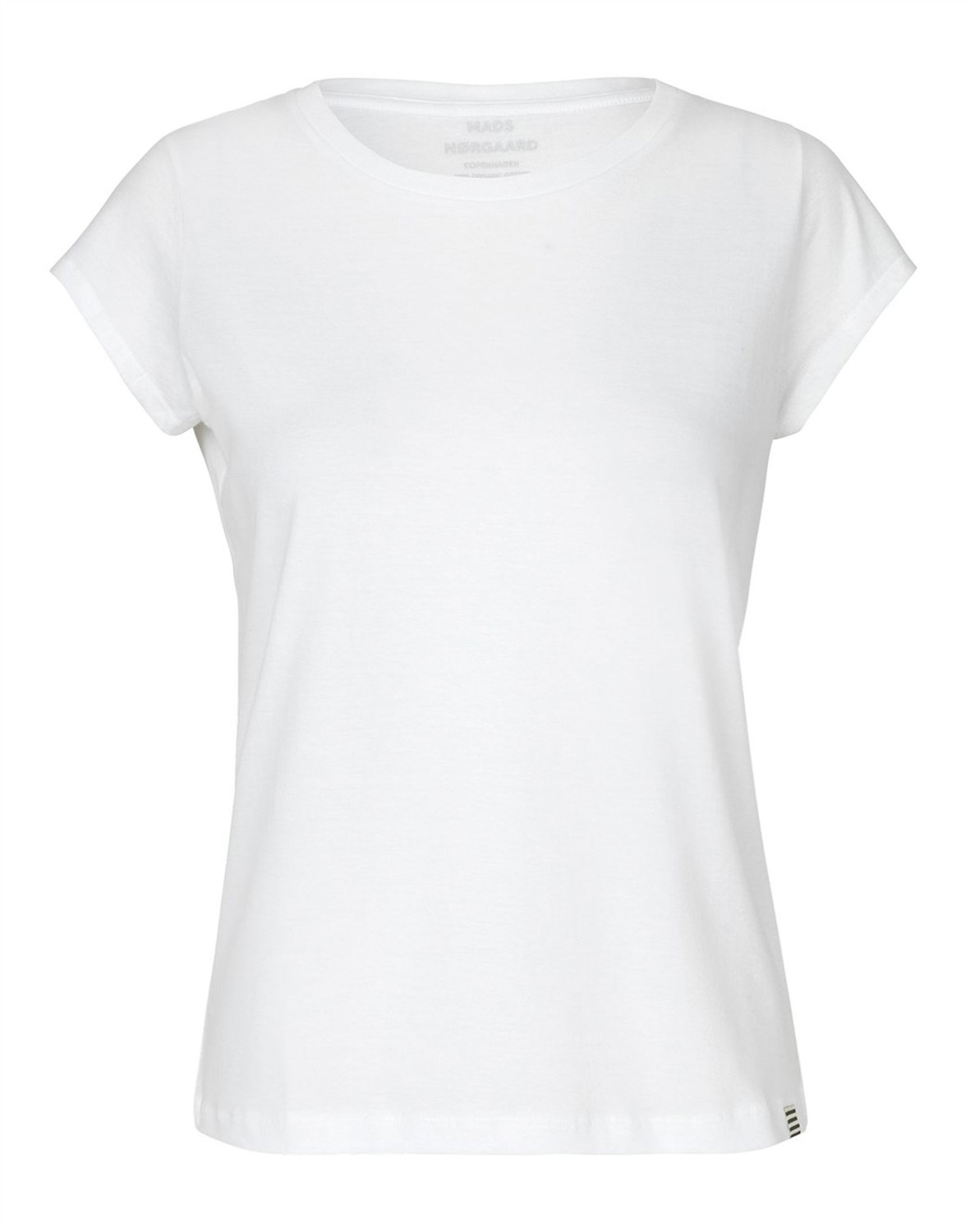 Organic Favorite Teasy - Mads Nørgaard Basis t-shirt i klassisk design og lækker økologisk bomuld fra Mads Nørgaard. T-shirten har rund hals, korte ærmer samt en let og løs pasform, som gør den komfortabel at have på. Der er det ikoniske stribede Mads Nørgaard logo påsyet i den nederste sømkant. Style Organic Favorite Teasy til alt - Perfekt t-shirt som er et absolut must-have i enhver kvindes basisgarderobe. Brug den både til hverdag og aften, alt efter hvilket look der måtte ønskes. Oplev alle de lækre nyheder fra Mads Nørgaard lige her.