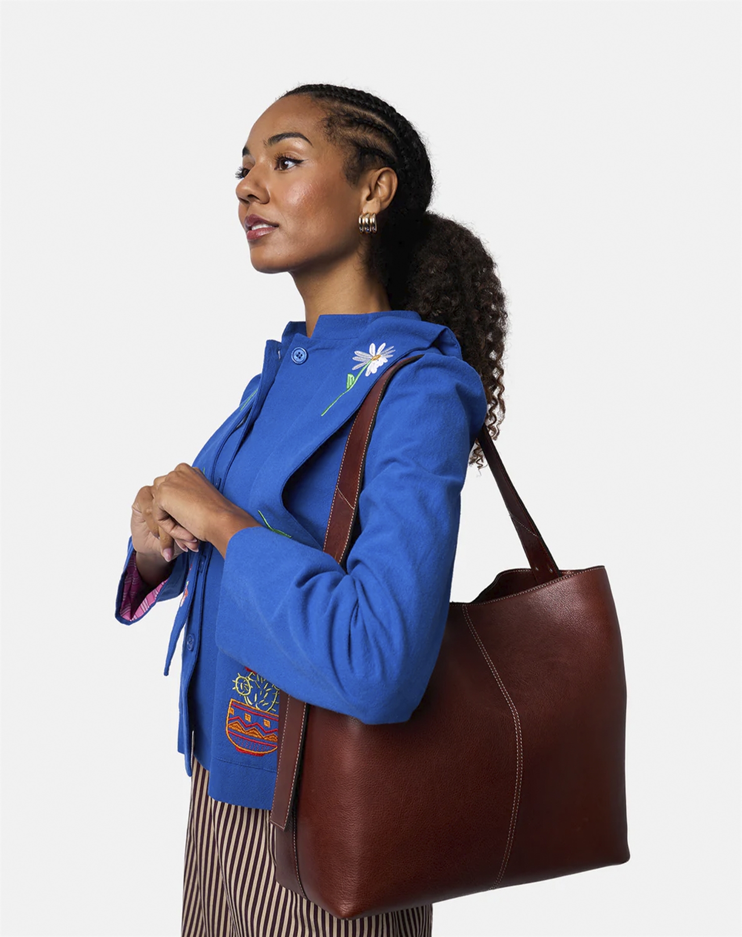 For at style "Naya Big Taske" kan du parre den med en trenchcoat og et par ankelstøvler for et sofistikeret look. Eller gå efter en mere afslappet stil med jeans, en løs bluse og sneakers. Taskens cognacfarve gør den alsidig og nem at matche med forskellige outfits og farver.