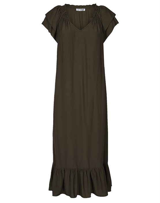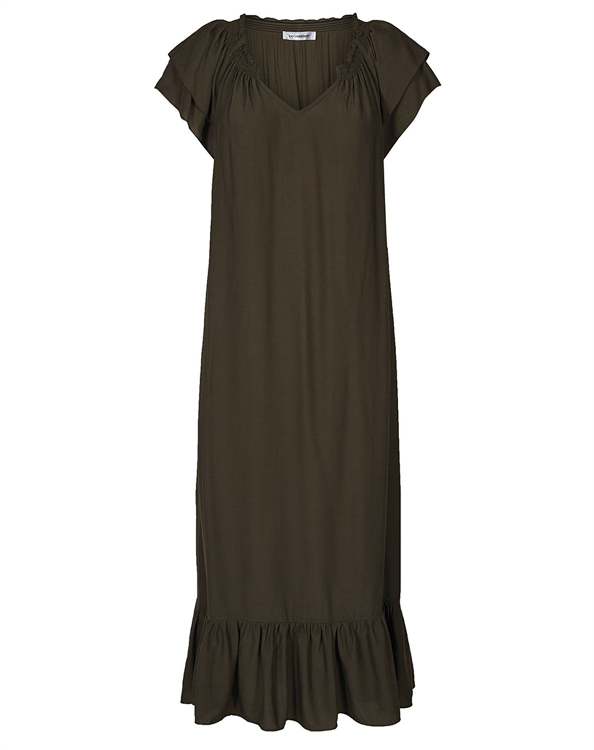 Lang kjole i stilfuldt design fra Co’Couture. Kjolen har en flot v-udskæring med smocksyninger samt korte ærmer med flot flæsekant. Kjolen har en let og løs pasform med flæsekant i bunden, som giver et flot og elegant fald samt et feminint look.