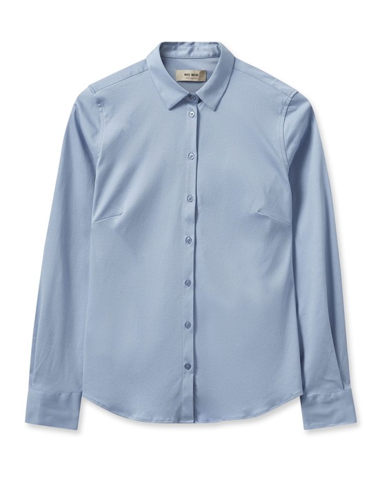 Tina Jersey Skjorte - Mos MoshTina jersey skjorte er perfekt til dig, der ønsker det stilfulde og smalle skjorte look, men samtidig ønsker fri bevægelighed og komfort. Den bløde Tina skjorte er lavet af det skønneste  og mest fleksible jersey materiale, men samtidig i tilpas kraftig kvalitet til den falder smukt og uden af smyge sig for meget i materialet. Med Tina jersey skjorten fra Mos Mosh til piger får du en stilren og klassisk skjorte, der er ekstrem blød og velsiddende. Du vil elske den både under dine habitter eller trøjer, men skjorten kan meget nemt også bæres helt alene sammen med både jeans eller pæne bukser. Tina jersye skjorten er for dig, der samtidig ønsker en lidt mere slim skjorte uden den sætter sig markant tæt. Vælg den klare lyse blå farve i Tina skjorten, hvis du ønsker et klassisk og frisk look.