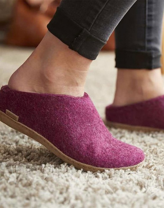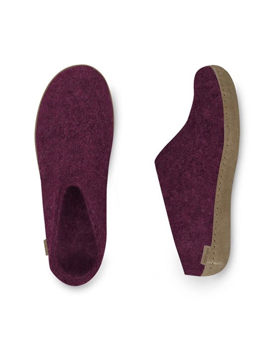 Tøffel - Cranberry - GlerupsSkønne tøfler i lækker filtet uldkvalitet fra ikoniske Glerups. Tøflen har et åbent og stilrent design, som gør dem lette at hoppe i. Futskoen har en lædersål af kalveskind, som sikrer at skoen står fast og giver fødderne den bedste komfort. Den lækre uldkvalitet sikrer varme og tørre fødder, året rundt. Perfekte hjemmesko i den lækreste farve, som er et absolut must-have i enhver garderobe.