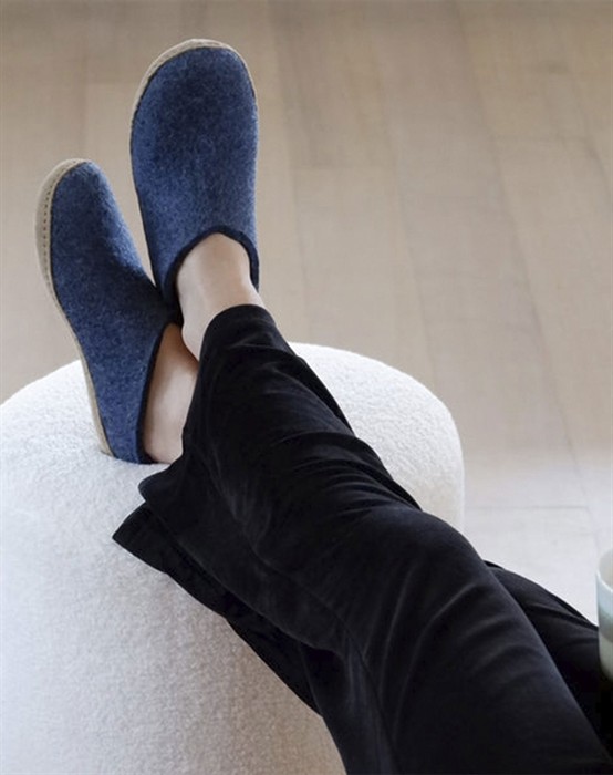 Tøffel - Denim - Glerups Skønne unisex tøfler i lækker filtet uldkvalitet fra ikoniske Glerups. Tøflen har et åbent og stilrent design, som gør dem lette at hoppe i. Futskoen har en lædersål af kalveskind, som sikrer at skoen står fast og giver fødderne den bedste komfort. Den lækre uldkvalitet sikrer varme og tørre fødder, året rundt. Perfekte hjemmesko i flot denim blå farve, som er et absolut must-have i enhver garderobe.