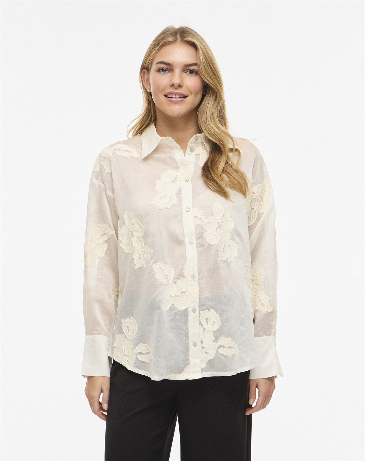 Denne skjorte kan nemt styles på forskellige måder. For et casual look kan du kombinere den med et par jeans og flade sko. Skal du til en middag eller et møde, kan du tilføje en nederdel og et par hæle for at opnå et mere sofistikeret udtryk. Den blomstrede detalje giver mulighed for at lege med forskellige accessories, som kan fremhæve dine personlige stilpræferencer.